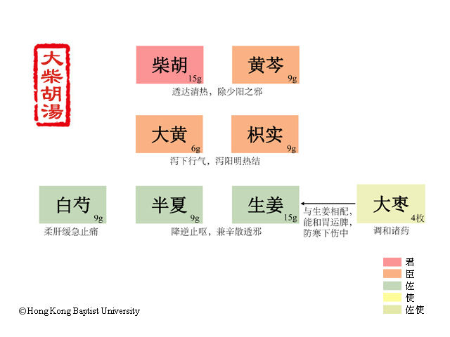 本方以和解少阳的小柴胡汤与轻下阳明热结的小承气汤合方加减而成。少阳之邪气未解,故取柴胡与黄芩相伍,和解清热,以解少阳之邪。柴胡善疏少阳之邪,黄芩清泄少阳郁热。里实已成,大黄配枳实,泻热通腑,行气破结,内泻阳明热结。芍药缓急止痛,与大黄相配可治腹中实痛,合枳实能调和气血,以除心下满痛;半夏和胃降逆,辛开散结;配伍大量生姜,既增止呕之功,又解半夏之毒。大枣和中益气,与生姜相配,调脾胃、和营卫,并调和诸药。诸药相伍,和下并用,主以和解少阳,辅以内泻热结,佐以缓急降逆,使少阳与阳明之邪得以分解。