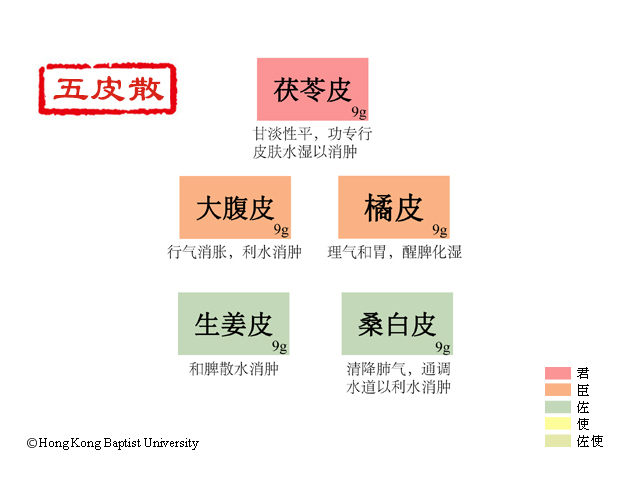 生姜皮 桑白皮 陈橘皮 大腹皮 茯苓皮各等分 (各9g)