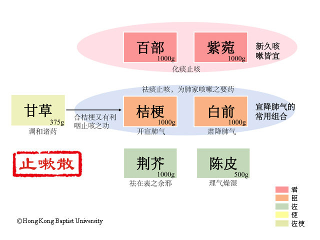 桔梗炒 荆芥 紫菀蒸 百部蒸 白前蒸,各二斤(各12g)甘草炒,十二两(4g) 陈皮水洗,去白,一斤(6g)