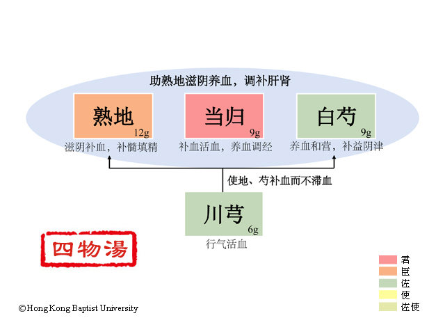 方中熟地甘温味厚,滋润入肾,填髓益精生血,为滋阴补血之要药,用为君药。当归补血和血,与熟地相伍,既增补血之力,又行营血之滞,为臣药。白芍养血柔肝敛阴,与地、归相协则滋阴补血之力更著,又可缓急止痛;川芎活血行气,与当归相协则行血之力益彰,又使诸药补血而不滞血,二药共为佐药。四药合用,阴柔辛甘相伍,补中寓行,补血不滞血,行血不伤血,共成补血调血之功。