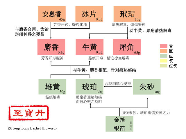 方中麝香芳香开窍醒神;牛黄豁痰开窍清热,合犀角(水牛角代)清心凉血解毒,共为君药。臣以冰片(龙脑)、安息香辟秽化浊,芳香开窍,与麝香合用,开窍之力尤为显著;玳瑁清热解毒,镇心安神,息风定惊,可增强犀角、牛黄清热解毒之力。佐以雄黄助牛黄豁痰解毒;朱砂重镇安神,又清心火;琥珀镇惊安神;金箔、银箔镇心安神定惊,与朱砂、琥珀同用,加强重镇安神之力。全方由贵重药材组成,治病救危,疗效卓著,故称“至宝丹”。