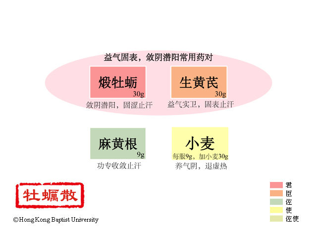此手太阴、少阴药也。陈来章曰:汗为心之液,心有火则汗不止,牡蛎、浮小麦之咸凉,去烦热而止汗;阳为阴之卫,阳气虚则卫不固,黄芪、麻黄根之甘温,走肌表而固卫。(汪昂《医方集解·收涩之剂》)