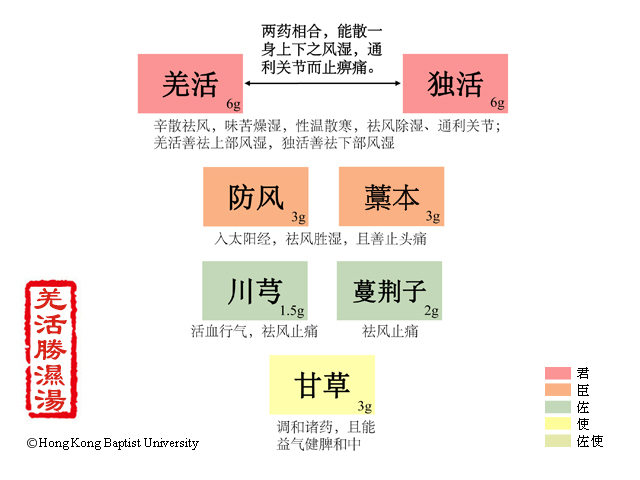 方中羌活、独活辛苦温燥,皆可祛风除湿,通利关节。其中羌活善祛上部风湿,独活善祛下部风湿,二者合用,可散周身风湿而止痹痛,共为君药。防风散风胜湿而治一身之痛;川芎上行头目,旁通络脉,既可疏散周身风邪,又能活血行气而止头身之痛,共助君药散邪通痹止痛之力,用为臣药。藁本疏散太阳经之风寒湿邪,且善达颠顶而止头痛;蔓荆子亦轻浮上行,主散头面之邪,并可清利头目,俱为佐药。甘草缓诸药辛散之性,并调和诸药,为佐使药。诸药配伍,可祛风胜湿,宣痹止痛。