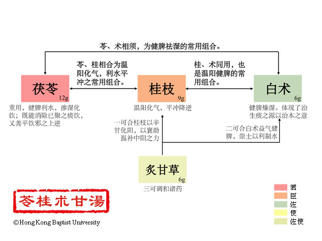 君以茯苓,以清胸中之肺气,则治节出而逆气自降。用桂枝以补心血,则营气复而经络自和。白术培既伤之元气,而胃气可复。甘草调和气血,而营卫以和,则头自不眩而身不振摇矣。(柯琴《伤寒来苏集·伤寒附翼》)