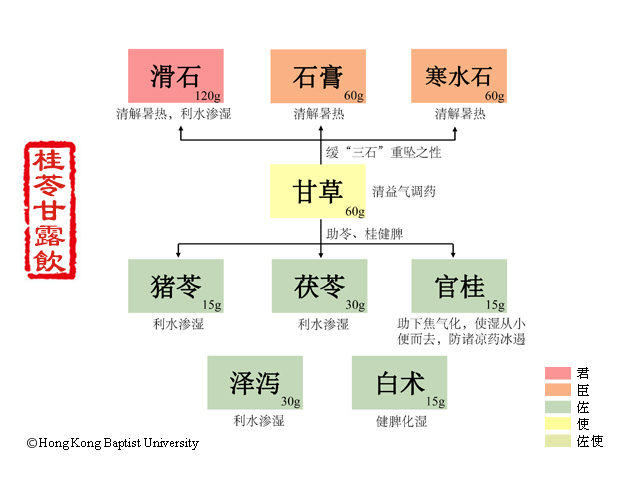 茯苓一两 (30g) 甘草二两,炙 (60g) 白术半两 (15g) 泽泻一两 (30g) 官桂去皮,二两 (15g) 石膏二两 (60g) 寒水石二两 (60g) 滑石四两 (120g) 猪苓半两 (15g)