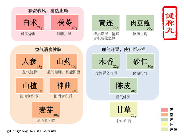 本方人参、白术、茯苓用量居多,法取“四君”之义,重在补气健脾运湿以止泻,共用为君。臣以山楂、神曲、麦芽消食和胃,除已停之积。再佐肉蔻、山药健脾止泻;木香、砂仁、陈皮理气开胃,醒脾化湿,且使全方补而不滞;黄连清热燥湿,以除食积所生之热。甘草补中和药,是为佐使之用。诸药共用,消补兼施,补重于消,补而不滞,消中寓清,使脾健、食消、气畅、热清、湿化。因方中四君子汤及山药等补气健脾之品居多,使脾健运而食积消,食积消则脾自健,故取名“健脾丸”。