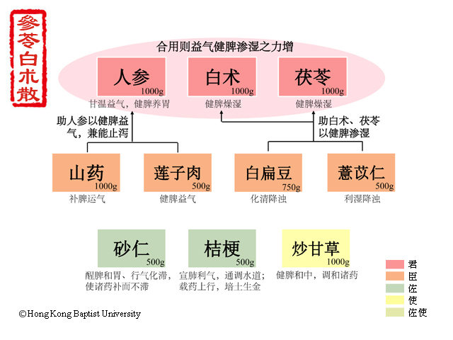 全方以益气健脾的四君子汤为基础,人参、白术、茯苓、炒甘草补益脾胃之气,又祛湿助运。配山药、莲子肉既助健脾益气,又涩肠止泻。伍白扁豆、薏苡仁化湿、渗湿以助健脾运湿。加砂仁芳香醒脾,行气和胃,既助除湿之力,又畅达气机;桔梗宣开肺气,通利水道以利止泻,并能载药上行,以益肺气而成“培土生金”之功。炒甘草健脾和中,调和药性。诸药相合,主以甘温补脾,纳芳化渗湿以助运止泻,引药入肺以培土生金,补中兼行,补而不滞。
