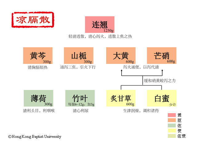川大黄 朴硝 炙甘草,各二十两 (各600g) 山栀子仁 薄荷去梗 黄芩各十两 (各300g) 连翘二斤半 (1250g)