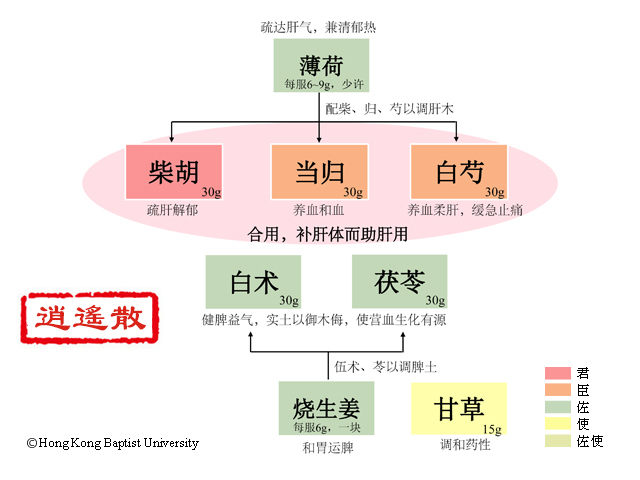 五脏苦欲补泻,云肝苦急,急食甘以缓之。盖肝性急善怒,其气上行则顺,下行则郁,郁则火动而诸病生矣。故发于上,则头眩耳鸣而或为目赤;发于中,则胸满胁痛而或作吞酸;发于下,则少腹疼疝而或溲溺不利;发于外,则寒热往来,似疟非疟。凡此诸症,何莫非肝郁之象乎?而肝木之所以郁,其说有二:一为土虚不能升木也,一为血少不能养肝也。盖肝为木气,全赖土以滋培,水以灌溉。若中土虚,则木不升而郁;阴血少,则肝不滋而枯。方用白术、茯苓者,助土德以升木也;当归、芍药者,益荣血以养肝也。薄荷解热,甘草和中。独柴胡一味,一以为厥阴之报使,一以升发诸阳。经云:木郁则达之。遂其曲直之性,故名曰逍遥。若内热、外热盛者,加丹皮解肌热,炒栀清内热,此加味逍遥散之义也。(吴谦《医宗金鉴·删补名医方论》)