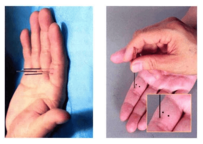 平卧,手心向上,取食指第一 节外上方,距大间穴上二分是穴。