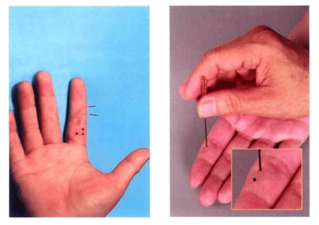 当食指第二节正中央线向外 开二分,距第三节横纹六分六是穴。