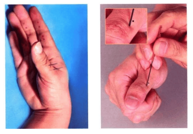 当大指第一节之内侧(中央 线内开二分),距前横纹三分之一处一穴,又距该横纹三分之二处一穴,共二穴。