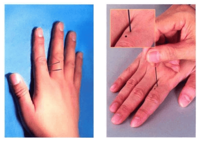 当食指背第一节中央线外开 二分直线上,距第二节横纹三分三为指五金穴,六分六为指千金穴。