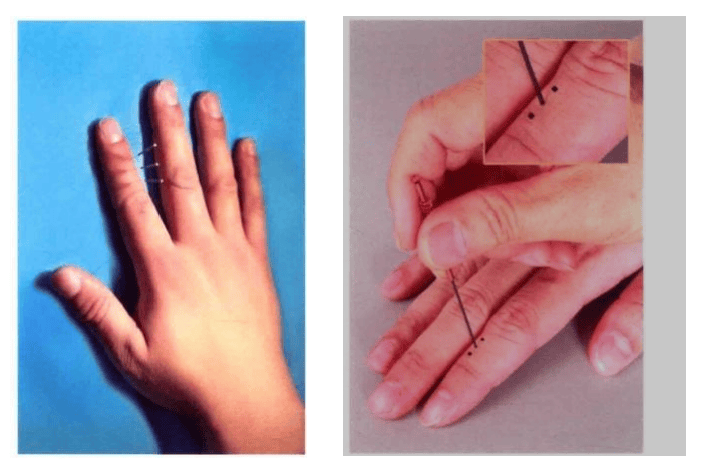 当食指背第二节中线外开二分之中点一穴,其上三分一穴,其下三分一穴,共三穴。