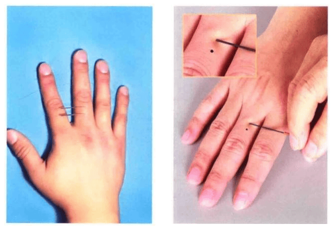 当中指背第一节中央线,距 第二节横纹三分三一穴,六分六一穴,共二穴。