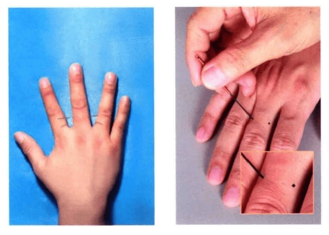 当中指第 一 节两侧之中点,共二穴。
