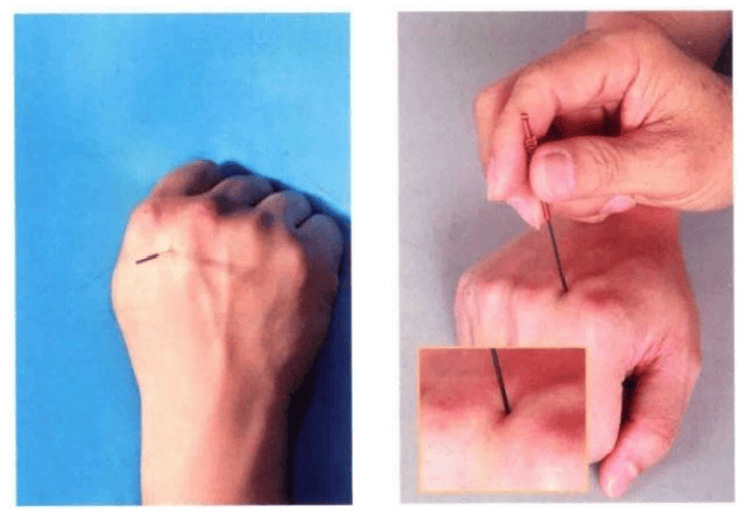 手背向上,距指骨与掌骨结合处下五分,食指骨与中指骨之间是穴。