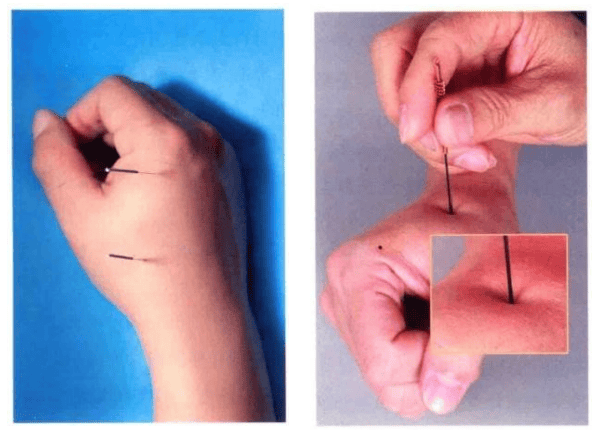 拳手立掌取穴,在拇指与食指叉骨间,第一掌骨与第二掌骨结合处,距大白穴 一 寸二分,与重仙穴相通。