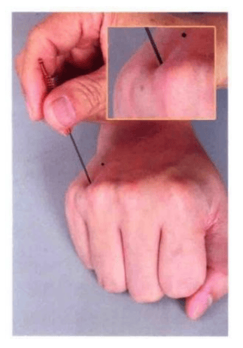 拳手取穴,在小指掌与无名 指掌骨之间,距指骨与掌骨接连处五分是穴。