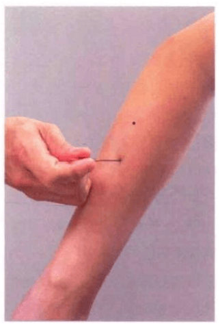 手抚胸取穴,当尺骨外侧,距 豌豆骨六寸五分,即火山穴外开五分处是穴,针向尺骨及桡骨间刺入。