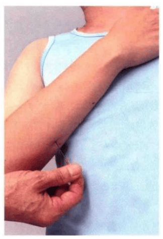 手抚胸取穴,当尺骨内侧中部,距豌豆骨(赖氏为腕豆骨) 六寸处取之。