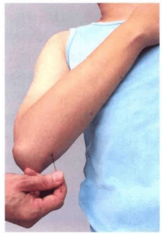 手抚胸取穴,在下尺骨内侧 陷处,距肘间一寸五分是穴。