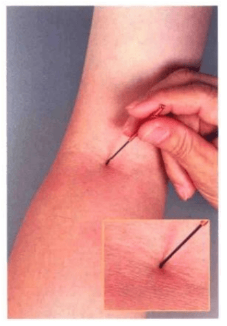 平手取穴,在肘窝横纹上,在 大筋之外侧以大指按下,肘伸屈时有一大凹陷处是穴。