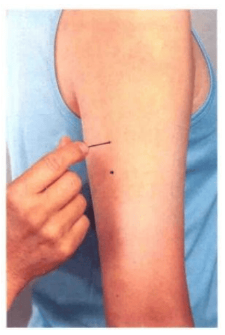 手臂下垂,在后臂肱骨之外侧,距富顶穴一寸处是穴。