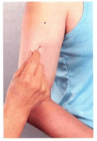 屈肘测量,以手拱胸,当后臂肱 骨之中部内缘与肱二头肌间之 陷处,亦即人宗穴上三寸是穴。