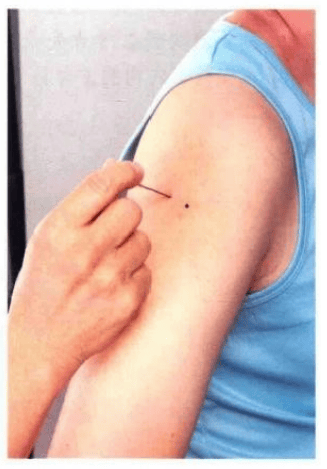 在上臂后侧,即肩中穴向后横开一寸是穴。