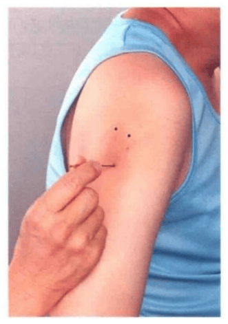 在肩端后直下,即后枝穴向后横开一寸是穴。
