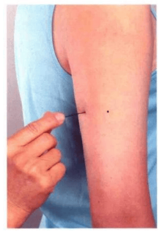 自肩端后侧直下,距肘横纹上七寸,即富顶穴向后横开 一寸是穴。