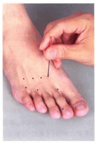 当第一跖骨与第二跖骨连接 部之直前陷中取之,即距火硬穴后一寸处取之。