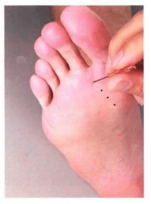 当足底第 一 与第二跖骨之 间,距趾间叉口五分一穴,又五分一穴,再五分一穴,再八分一穴,共四穴。