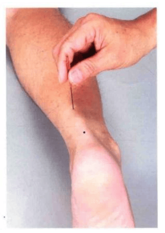当足后跟筋之正中央上,距正筋穴上二寸处是穴。