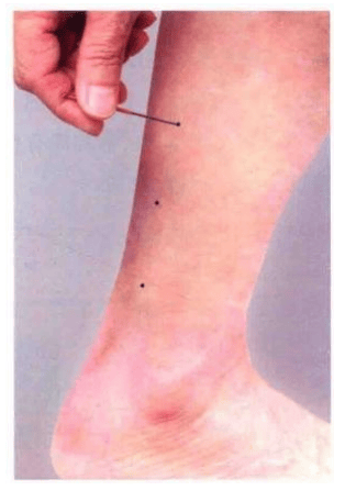在外踝后一寸半之直线上取之:当外踝尖直后一寸半之上二寸一穴,又上二寸一穴,再上二寸一穴,共三穴。