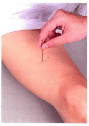 当大腿正中线之股骨上,距膝盖横纹上五寸处是穴。
