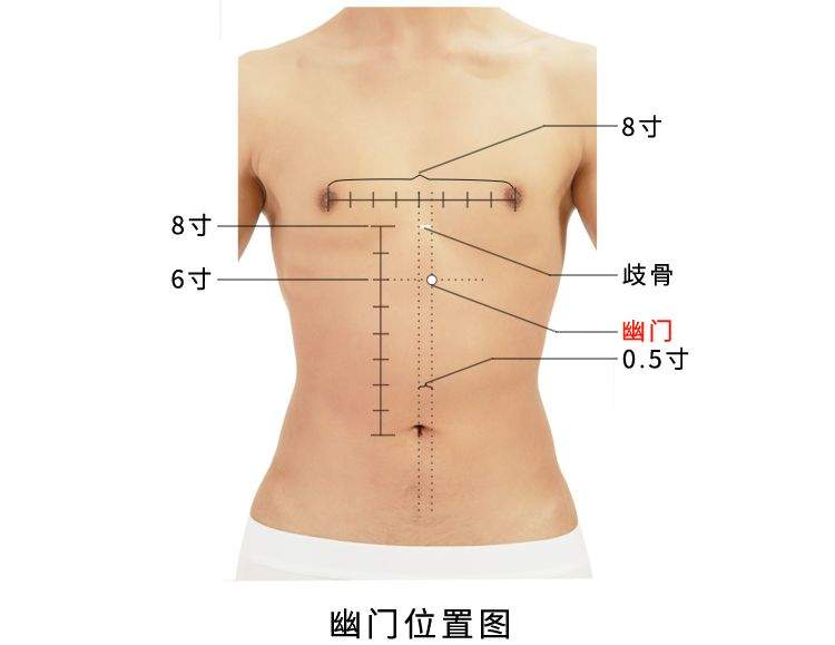 在上腹部,当脐中上6寸,前正中线旁开0.5寸。