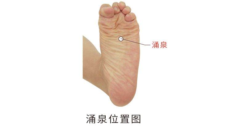 在足底部,卷足时足前部凹陷处,约当第2、3趾趾指缝纹头端与足跟连线的前1/3与后2/3交点上。