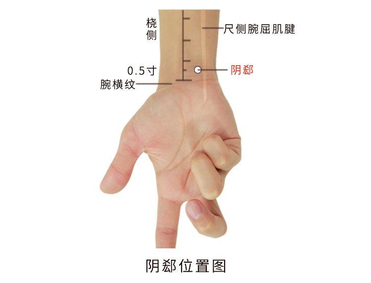 在前臂掌侧,当尺侧腕屈肌腱的桡侧缘,腕横纹上0.5寸。