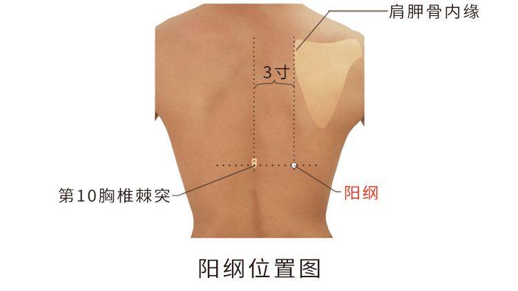 阳,阳气也。纲,网上之总绳也。阳纲名意指胆腑的阳气由此外输膀胱经。阳纲穴与胆俞穴相对,气血物质皆来自胆腑,胆腑气血处半表半里,而本穴又在背外之侧,穴内物质为胆腑外输的阳热风气,此阳热风气即是脏腑外输的阳气汇聚而成,有对体内外输的阳气抓总提纲作用,故名阳纲。