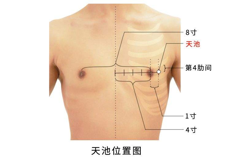 1)天池。天,天部也。池,储液之池也。天池名意指心包外输的高温水气在此冷凝为地部经水。本穴位于乳头外侧,而乳头为人体体表的高地势处,亦是本穴也位于高地势处,即天部,穴内物质又为心包经募穴膻中穴传来的高温水气,至本穴后散热冷降为地部经水,本穴气血既处高位又为经水,故名天池。2)天会。天,天部之气也。会,会合也。天会名意指心包经外输的高温水气在此会合。本穴物质为膻中穴上行而至的高温水气,至本穴后散热冷缩而为会合之状,故名天会。