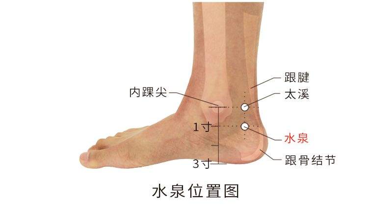 定位: 在足内侧,内踝后下方,当太溪直下1寸,跟骨结节的内侧凹陷处。