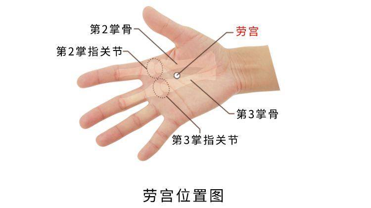 定位: 在手掌心,当第2、3掌骨之间偏于第3掌骨,握拳屈指的中指尖处。