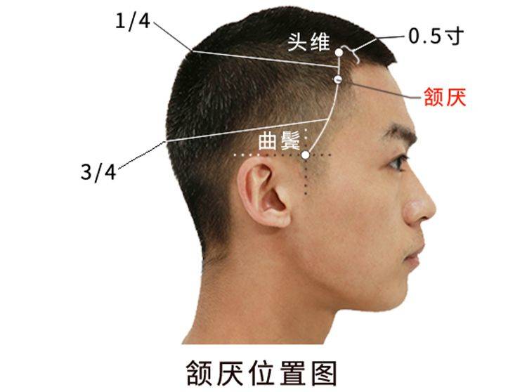 定位: 在头部鬓发上,当头维与曲鬓弧形连线的上四分之一与下四分之三交点处。
