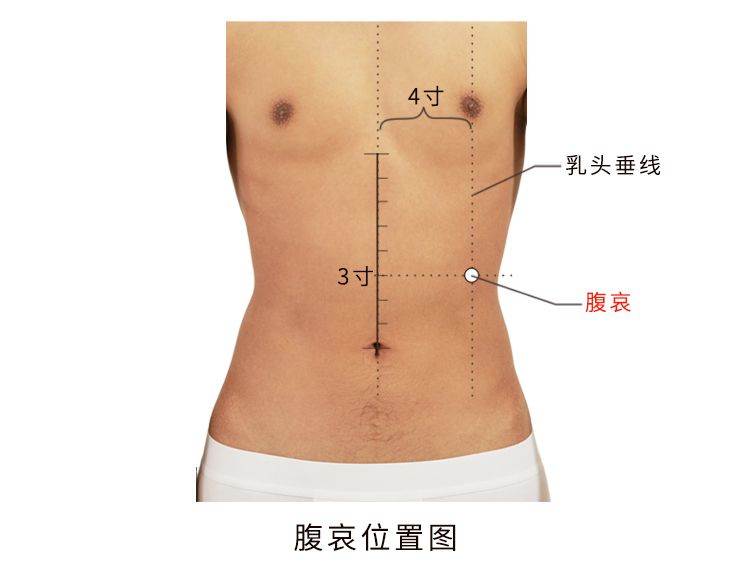 腹哀呢?我们从任脉开始找。这是腰,这是肚脐,这是肋骨,这是中脘,这是水分、下脘、建里。建里外开四寸是腹哀。治症都一样,腹部、肠胃的问题、大便不顺、胃不消化,都可以用这个穴道。